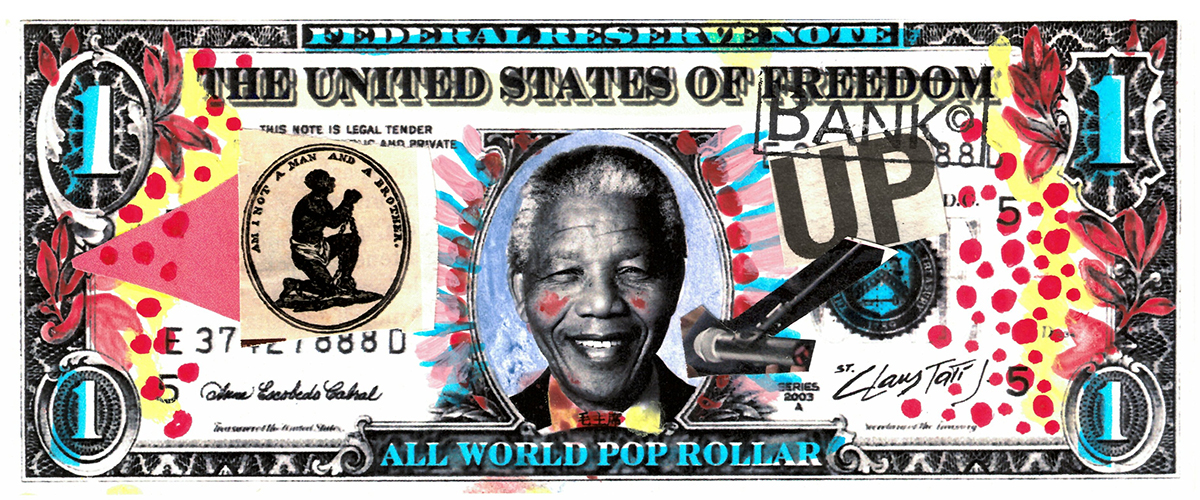 Ogni singola Banconota Nelson Mandela emessa dalla POP ROLLAR BANK è unica e inimitabile in quanto viene dipinta a mano secondo l’estro creativo dell’artista e Fondatore st. Claus Tatí J.